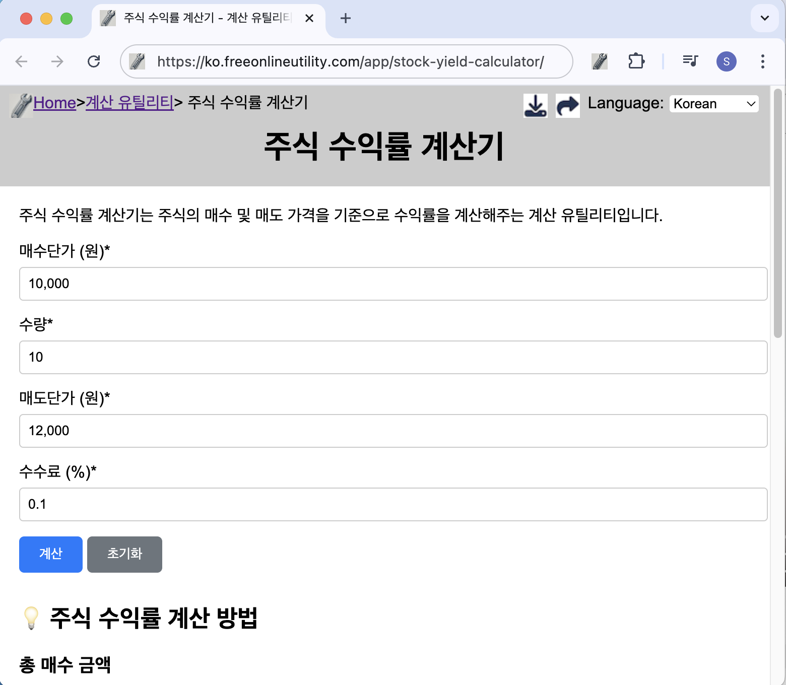 주식 수익률 계산기는 투자자들이 매수와 매도 가격을 기준으로 간편하게 수익률을 확인할 수 있도록 돕는 무료 온라인 계산기입니다. 별도의 설치 없이 웹 브라우저에서 바로 사용할 수 있어 누구나 손쉽게 이용할 수 있습니다.