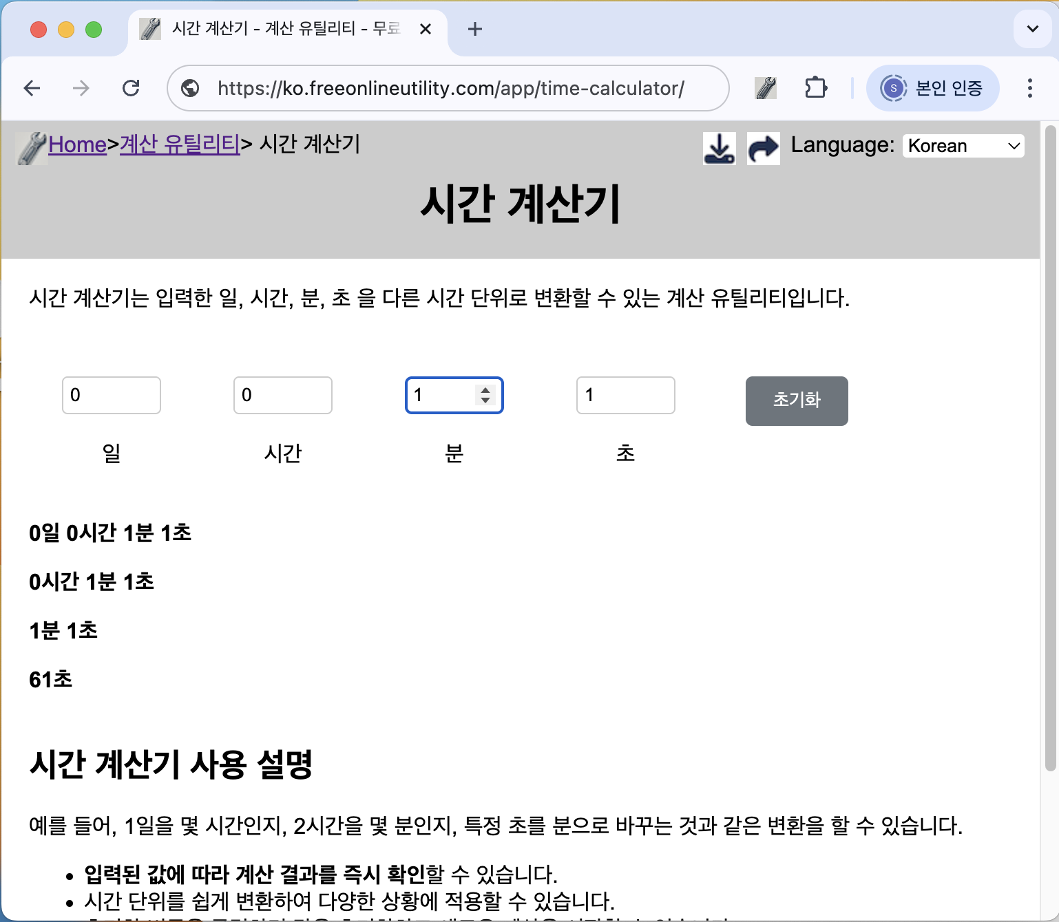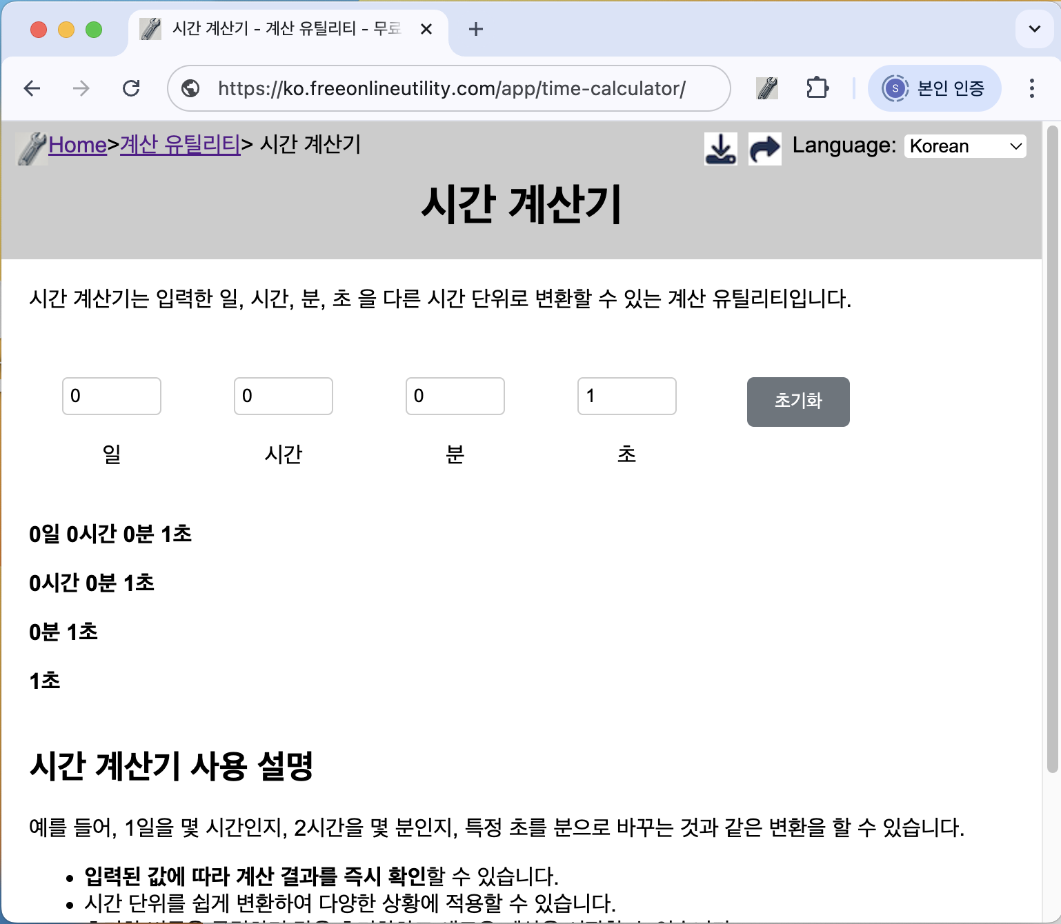 시간 계산기는 일, 시간, 분, 초를 입력하여 다양한 단위로 실시간 변환해주는 무료 온라인 유틸리티입니다. 설치 없이 브라우저에서 간편하게 사용할 수 있습니다.