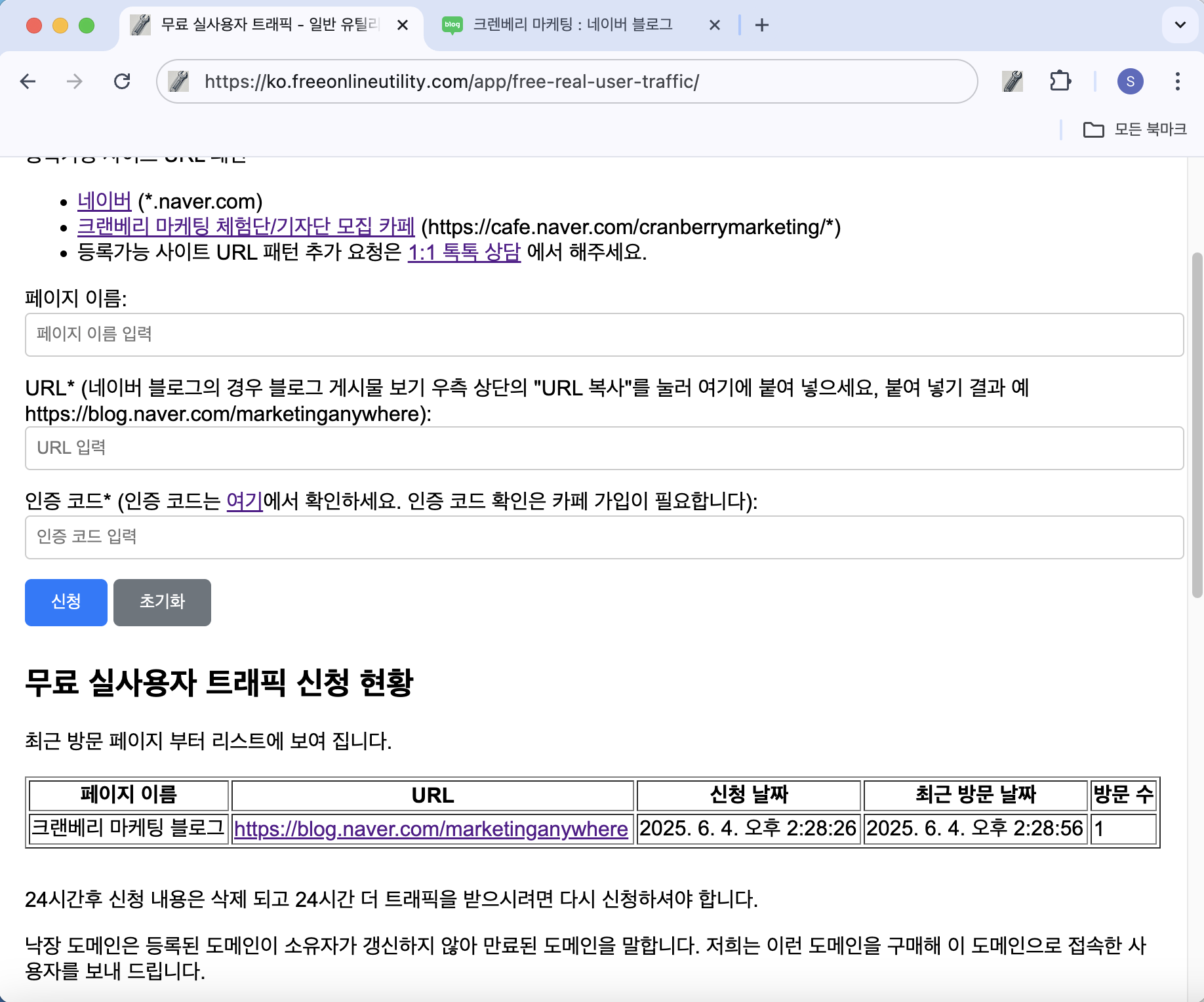 - 신청 후 24시간 동안 실사용자 트래픽이 자동으로 유입됩니다.
