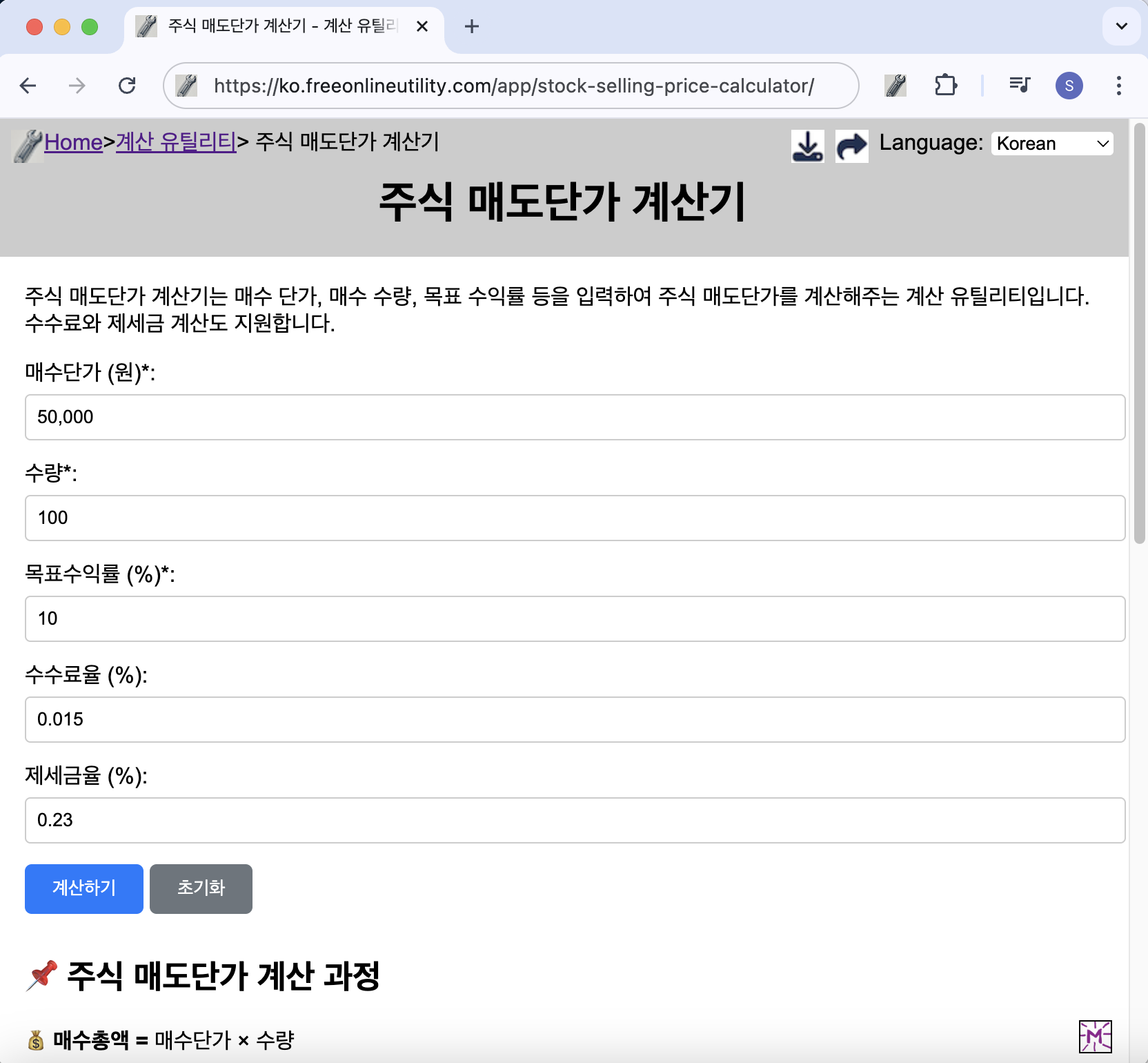 - 주식 매도단가 계산기에 접속합니다.
