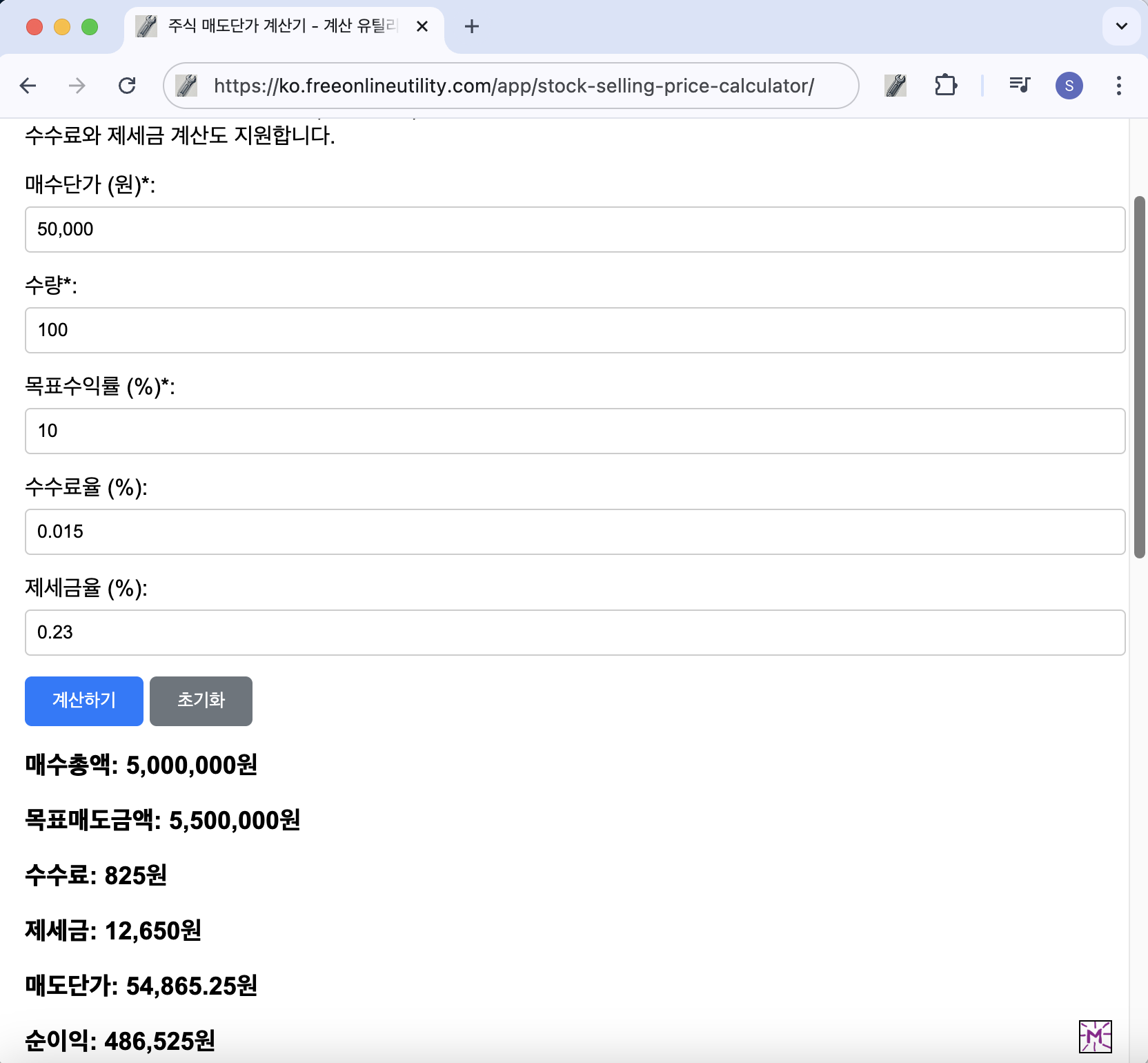 - 계산 버튼을 클릭하면 수수료와 세금을 반영한 매도단가가 표시됩니다.