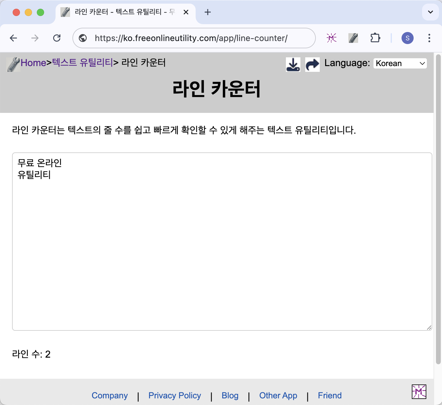라인 카운터는 입력한 텍스트의 줄 수를 빠르고 정확하게 계산해주는 무료 온라인 도구입니다. 별도의 프로그램 설치 없이 브라우저에서 바로 사용할 수 있어 편리합니다.라인 카운터 바로가기 라인 카운터의 주요 기능실시간 줄 수 계산: 텍스트 입력 시 자동으로 줄 수를 계산간편한 사용법: 별도의 설정 없이 바로 사용 가능텍스트 복사 및 저장 기능: 입력한 내용을 쉽게 복사하거나 저장 가능다양한 환경 지원: PC, 태블릿, 모바일에서 최적화된 사용 경험 제공라인 카운터 페이지 가기라인 카운터 사용 방법라인 카운터 페이지로 이동합니다.텍스트 입력 창에 확인하고 싶은 내용을 입력합니다.입력과 동시에 자동으로 줄 수가 계산됩니다.필요 시 결과를 복사하거나 저장하여 활용합니다.라인 카운터 활용 예시라인 카운터는 소스 코..