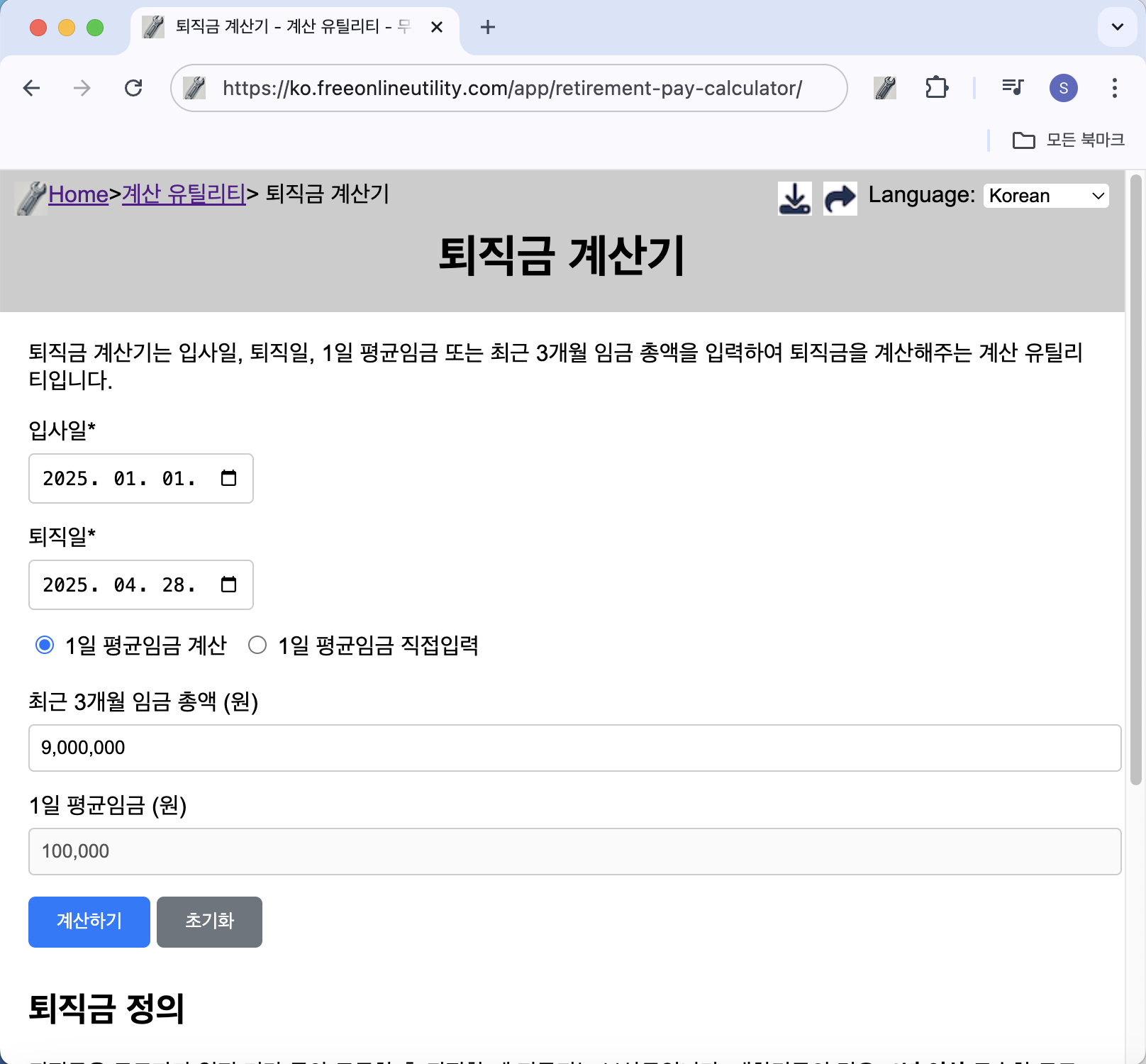 퇴직금 계산기는 입사일, 퇴직일, 1일 평균임금 또는 최근 3개월 임금 총액을 입력하여 퇴직금을 계산해주는 무료 온라인 유틸리티입니다. 퇴직금을 손쉽게 계산할 수 있어, 많은 직장인들이 자신의 퇴직금을 확인하고 미리 준비할 수 있도록 도와줍니다.퇴직금 계산기 가기 퇴직금 계산기의 주요 기능간편한 입력: 입사일과 퇴직일을 입력한 후, 1일 평균임금 또는 최근 3개월 임금 총액을 입력하여 퇴직금을 계산실시간 계산: 바로 계산된 퇴직금 결과를 확인할 수 있습니다.모바일 호환: 모바일에서도 쉽게 사용 가능하여 언제 어디서나 퇴직금 계산이 가능합니다.직관적인 인터페이스: 누구나 쉽게 사용할 수 있는 직관적인 디자인퇴직금 계산기 가기퇴직금 계산기 사용 방법퇴직금 계산기 페이지로 이동합니다.입사일과 퇴직일을 입력합..