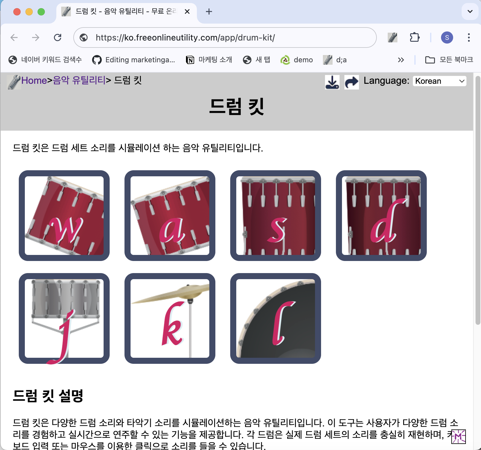 드럼 킷은 키보드나 마우스를 통해 실제 드럼처럼 연주할 수 있는 무료 온라인 유틸리티입니다. 설치 없이 웹 브라우저에서 바로 사용할 수 있어 음악 초보자부터 전문가까지 누구나 쉽게 활용할 수 있습니다. 드럼 킷의 주요 기능실시간 드럼 연주: 키보드 또는 마우스 클릭으로 드럼 사운드를 즉시 재생직관적인 인터페이스: 버튼을 누르기만 하면 다양한 드럼 소리 체험 가능다양한 드럼 구성: 스네어, 탐탐, 킥, 심벌 등 다양한 소리 구현별도 설치 불필요: 웹에서 바로 사용 가능드럼 킷 사용 방법드럼 킷 페이지로 이동합니다.화면에 표시된 버튼을 클릭하거나 키보드의 w, a, s, d, j, k, l 키를 눌러 소리를 재생합니다.각 키는 다른 드럼 사운드에 연결되어 있어 다양한 연주가 가능합니다.자유롭게 조합하여 나..