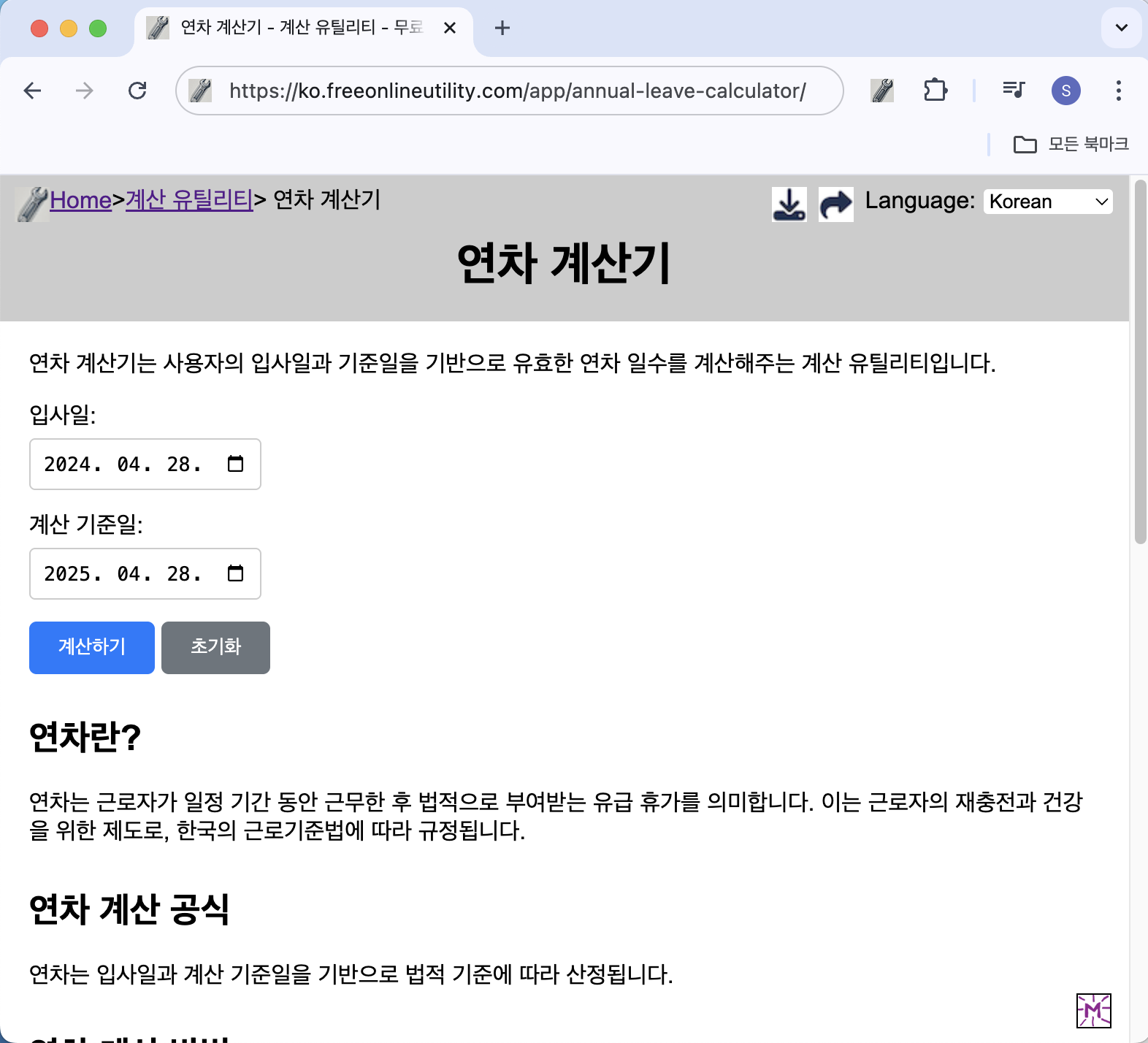 연차 계산기는 입사일과 기준일을 입력하면 자동으로 유효 연차 일수를 계산해주는 무료 온라인 유틸리티입니다. 별도의 설치 없이 브라우저에서 바로 사용할 수 있어 누구나 간편하게 이용할 수 있습니다. 지금 바로 연차 계산기를 사용해보세요. 연차 계산기의 주요 기능간편한 날짜 입력: 입사일과 계산 기준일만 선택하면 자동으로 계산정확한 계산 공식: 근로기준법에 기반한 공식 적용즉시 결과 확인: 계산 버튼 클릭 시 실시간 연차 결과 제공브라우저 기반 사용: PC는 물론 모바일과 태블릿에서도 최적화된 사용 가능연차 계산기 가기연차 계산기 사용 방법연차 계산기 페이지로 이동합니다.입사일과 기준일을 달력에서 선택합니다.‘계산하기’ 버튼을 클릭하면 연차 일수를 바로 확인할 수 있습니다.필요 시 ‘초기화’ 버튼으로 다시 ..