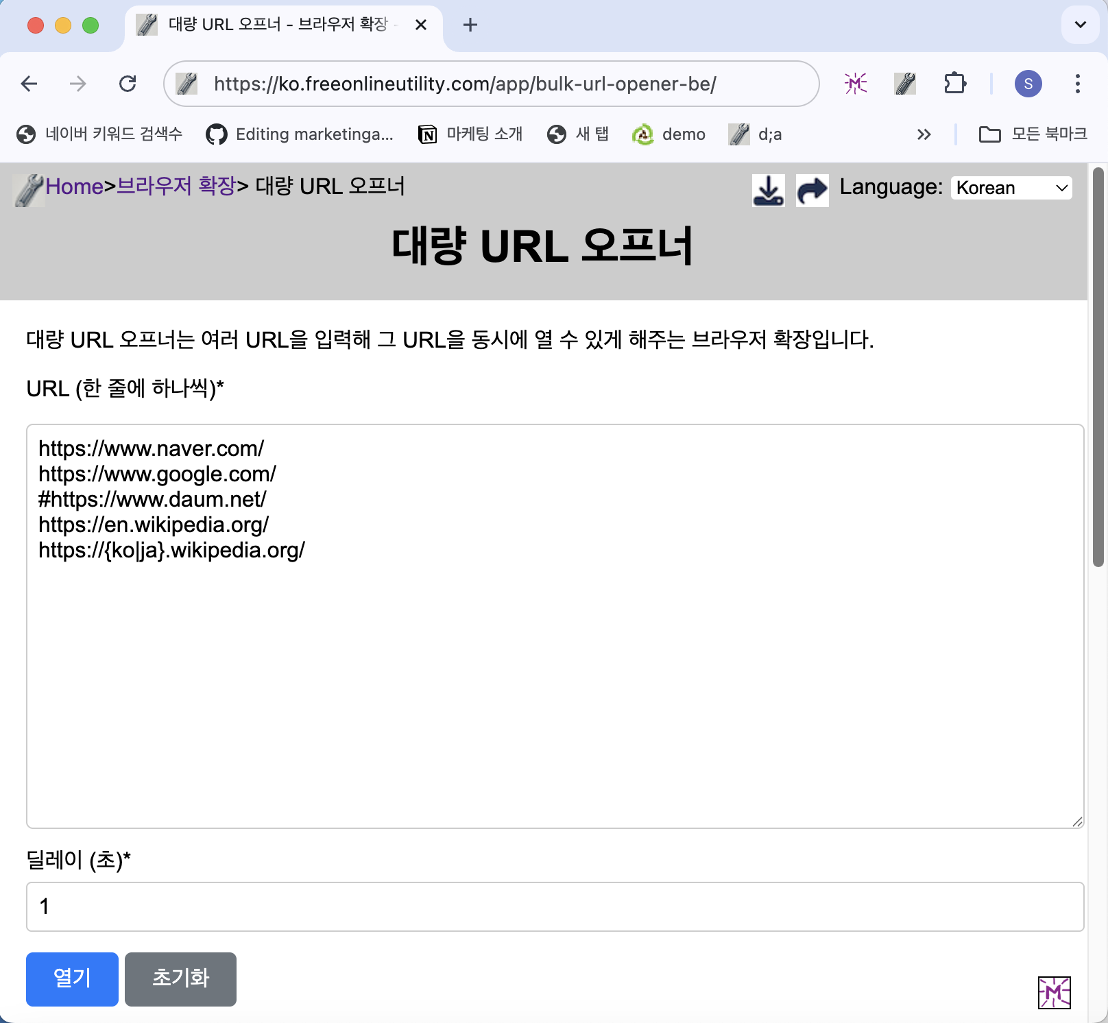 대량 URL 오프너는 다수의 웹사이트 주소를 한 번에 입력하고 새 탭으로 동시에 열 수 있게 해주는 간편한 무료 온라인 유틸리티입니다. 별도의 프로그램 설치 없이 브라우저에서 바로 실행되며 누구나 쉽게 사용할 수 있습니다.👉 대량 URL 오프너 바로가기 대량 URL 오프너 주요 기능다중 URL 열기: 여러 웹 주소를 입력하면 새 탭에서 한 번에 열 수 있습니다.딜레이 설정: 탭 열기 간격(초 단위)을 조절해 브라우저 부하를 줄일 수 있습니다.브라우저 확장 지원: 크롬 및 기타 브라우저에서 확장 프로그램으로 설치하여 더욱 빠르고 편리하게 이용 가능초기화 기능: 입력한 주소를 손쉽게 초기화 가능👉 지금 바로 사용해보세요대량 URL 오프너 사용 방법대량 URL 오프너 페이지로 이동합니다.URL을 한 줄에 ..