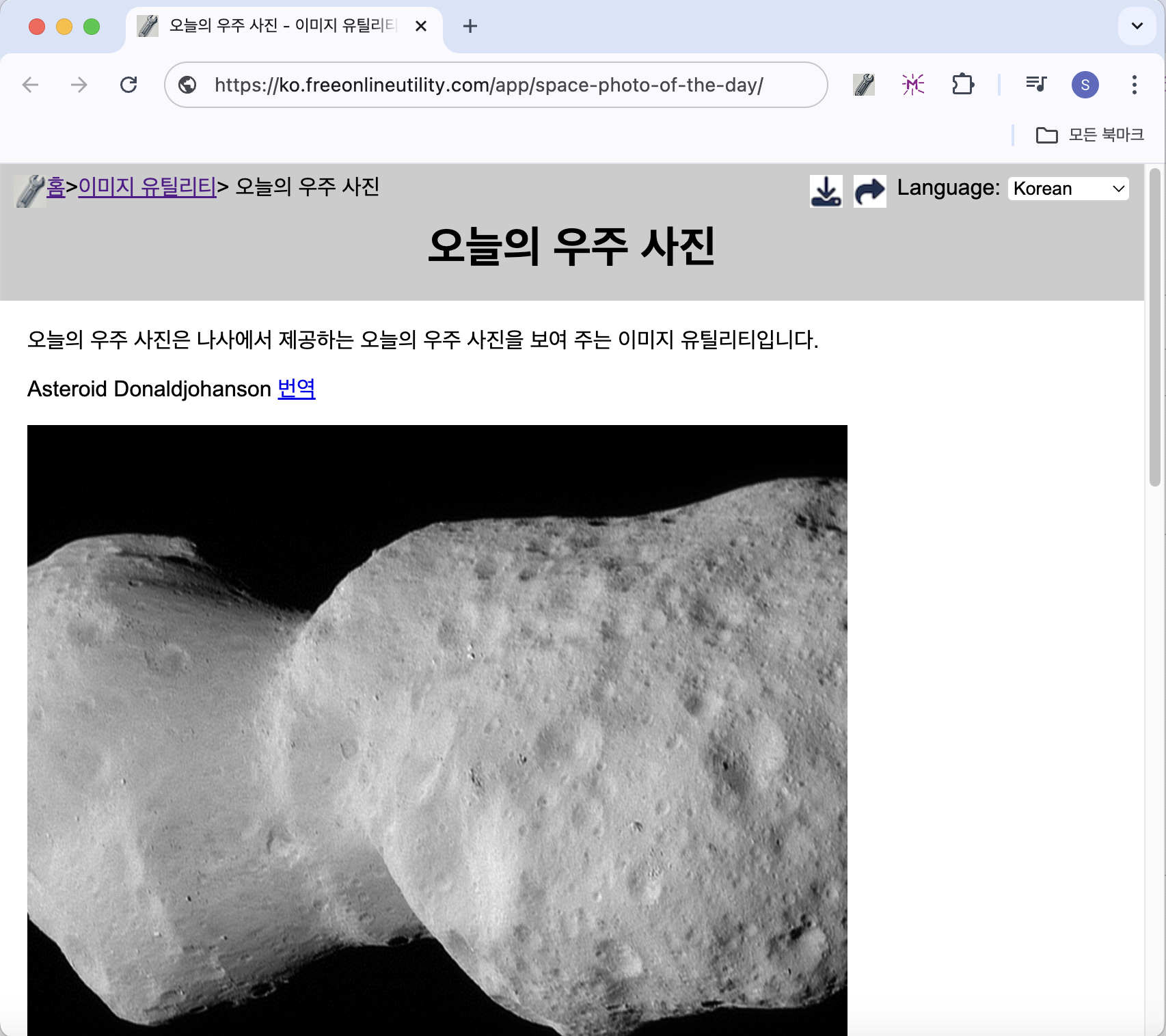 오늘의 우주 사진은 NASA(미 항공우주국)에서 매일 제공하는 아름다운 우주 사진을 보여주는 무료 온라인 유틸리티입니다. 별도의 설치 없이 브라우저에서 간편하게 이용할 수 있어 누구나 쉽게 감상할 수 있습니다. 지금 바로 오늘의 우주 사진 보러가기를 이용해 보세요. 오늘의 우주 사진 주요 기능매일 업데이트: NASA에서 제공하는 새로운 우주 사진을 매일 받아볼 수 있습니다.간편한 번역 기능: 사진 설명과 제목을 한국어로 쉽게 번역할 수 있습니다.고해상도 이미지 지원: 원본 고화질 사진을 클릭 한 번으로 확인 가능합니다.모바일 최적화: 스마트폰과 태블릿에서도 매끄럽게 감상할 수 있습니다.놀라운 우주 사진을 간편하게 감상하고 싶다면 오늘의 우주 사진 보러가기를 클릭하세요!오늘의 우주 사진 사용 방법오늘의..