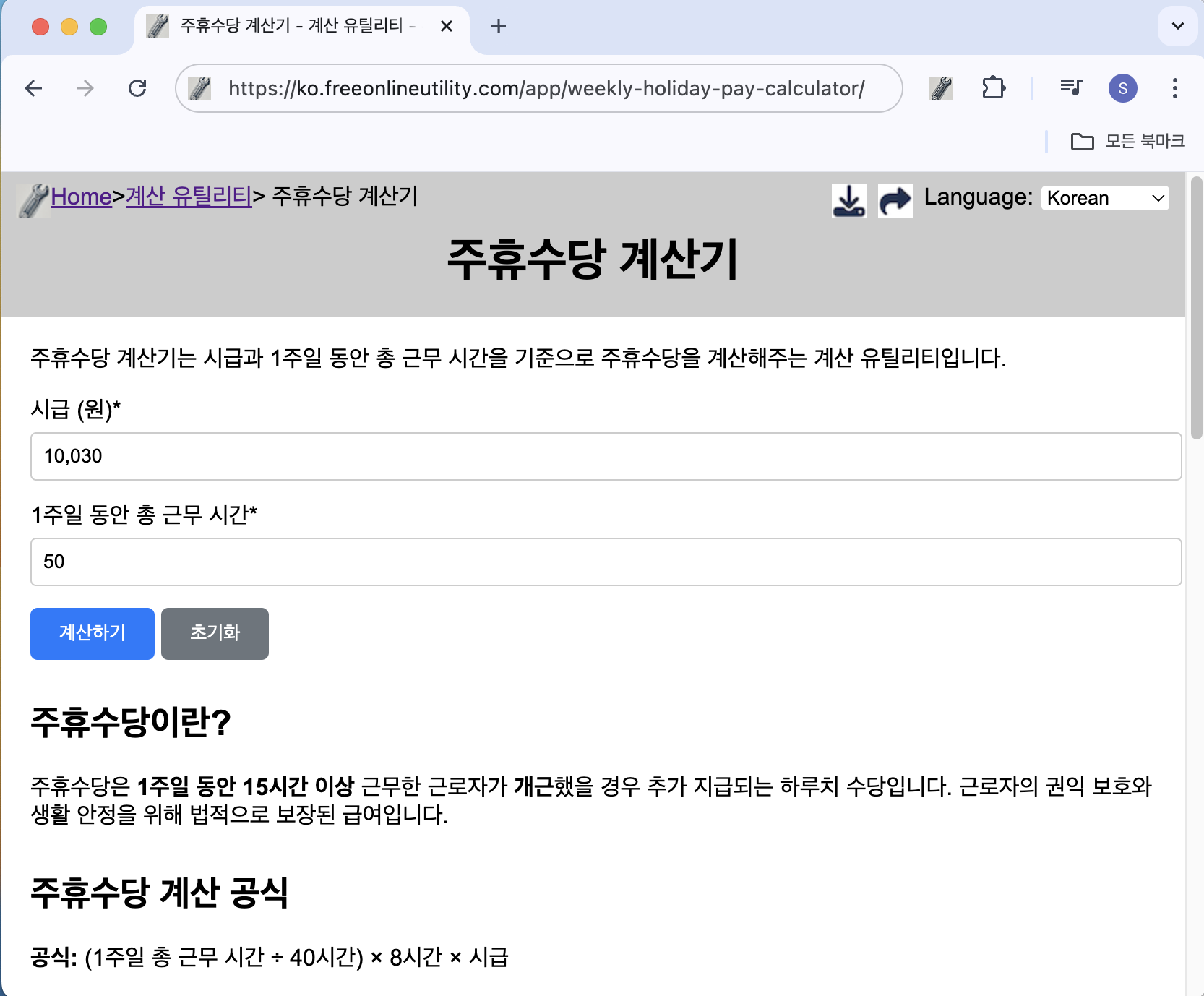 주휴수당 계산기는 시급과 주간 근무 시간을 기준으로 법적 기준에 따라 주휴수당을 빠르게 계산해주는 무료 온라인 도구입니다. 주휴수당 계산기는 설치 없이 브라우저에서 바로 사용할 수 있어 누구나 쉽게 이용할 수 있습니다. 주휴수당 계산기의 주요 기능직관적인 입력 방식: 시급과 1주일 동안의 근무 시간만 입력하면 자동 계산법정 기준에 맞춘 정확한 계산: 40시간 초과 근무 시, 법정 기준에 맞게 계산 적용빠른 결과 확인: 버튼 클릭 한 번으로 결과 즉시 출력모바일 완벽 대응: 스마트폰 및 태블릿에서도 문제없이 사용 가능주휴수당 계산기 가기주휴수당 계산기 사용 방법주휴수당 계산기 페이지에 접속합니다.시급과 1주일 동안의 총 근무 시간을 입력합니다.‘계산하기’ 버튼을 클릭하면 결과가 즉시 표시됩니다.초기화를 ..