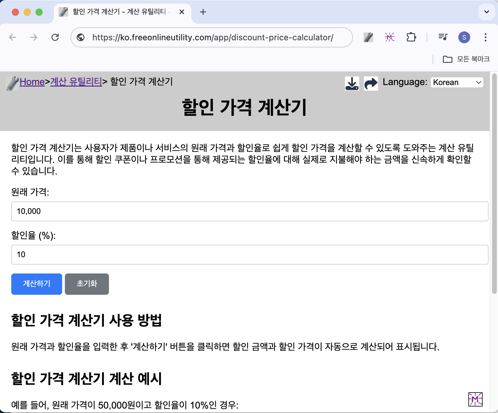 할인 가격 계산기는 제품이나 서비스의 원래 가격과 할인율을 입력하면 최종 결제 금액을 자동으로 계산해주는 무료 온라인 도구입니다. 별도의 앱 설치 없이 웹에서 즉시 사용할 수 있어, 쇼핑할 때 매우 유용합니다.→ 할인 가격 계산기 바로가기할인 가격 계산기의 주요 기능직관적인 입력 방식: 원가와 할인율을 입력하면 자동으로 최종 금액 계산다양한 할인 시나리오 지원: 정률 할인뿐 아니라 복합 할인 계산도 가능모바일 최적화: 스마트폰에서도 완벽하게 작동실시간 결과 확인: 입력과 동시에 결과 확인→ 할인 가격 계산하러 가기할인 가격 계산기 사용 방법할인 가격 계산기 페이지로 이동합니다.상품의 원래 가격을 입력합니다.적용할 할인율(%)을 입력합니다.자동으로 계산된 최종 결제 금액을 확인합니다.활용 예시쇼핑몰 할인 ..