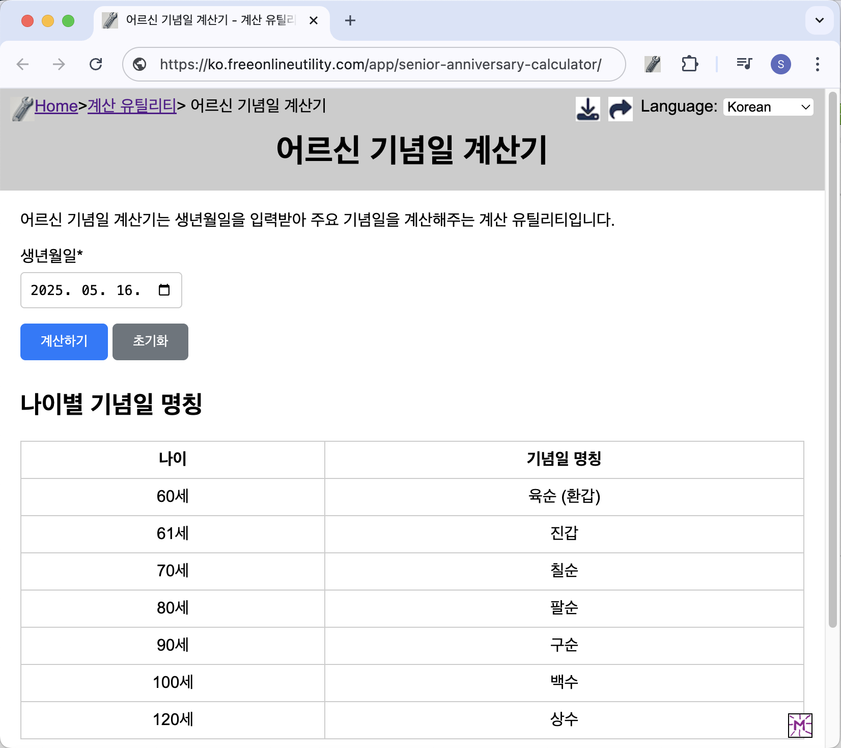 어르신 기념일 계산기는 생년월일을 입력하면 육순, 진갑, 칠순, 팔순, 백수 등 어르신의 주요 인생 기념일을 자동으로 계산해주는 무료 온라인 도구입니다. 별도의 설치 없이 누구나 손쉽게 사용할 수 있습니다.어르신 기념일 계산기의 핵심 기능정확한 기념일 계산: 입력한 생년월일 기준으로 주요 기념일 자동 계산간편한 사용법: 생년월일만 입력하면 즉시 결과 확인모바일 최적화: PC는 물론 스마트폰과 태블릿에서도 손쉽게 사용 가능무료 이용: 누구나 부담 없이 무료로 사용 가능어르신 기념일 계산기 가기어르신 기념일 계산기 사용 방법어르신 기념일 계산기 페이지로 이동합니다.생년월일을 입력한 후 계산하기 버튼을 클릭합니다.자동으로 계산된 주요 기념일을 확인합니다.기념일 내용을 저장하거나 공유하여 가족 모임이나 행사 준..