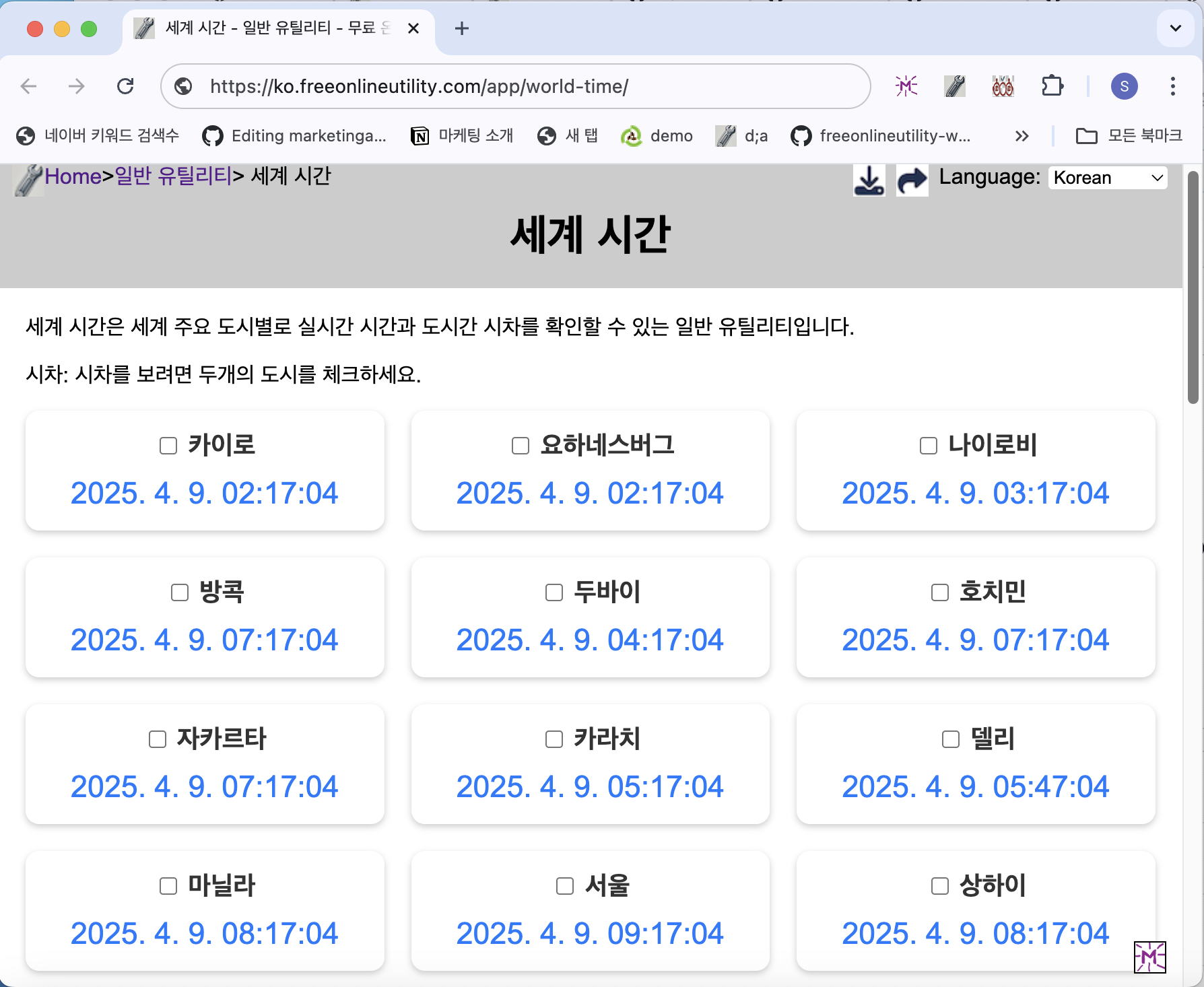세계 시간은 세계 주요 도시들의 현재 시각을 실시간으로 확인하고, 도시 간 시차를 비교할 수 있는 편리한 온라인 도구입니다. 별도의 설치 없이 브라우저만 있으면 누구나 쉽게 이용할 수 있습니다.👉 세계 시간 도구 바로가기 세계 시간의 핵심 기능실시간 시간 확인: 세계 주요 도시의 현재 시각을 실시간으로 표시도시간 시차 계산: 두 도시를 선택하면 자동으로 시차 계산직관적인 인터페이스: 도시 선택만으로 즉시 정보 확인 가능모바일 최적화: 스마트폰 및 태블릿에서도 원활하게 사용 가능👉 세계 시간 기능 자세히 보기세계 시간 도구 사용 방법세계 시간 페이지로 이동합니다.표시된 도시 중 원하는 도시를 체크박스로 선택합니다.두 개의 도시를 선택하면 자동으로 시차가 계산되어 표시됩니다.각 도시의 실시간 시간을 확인..