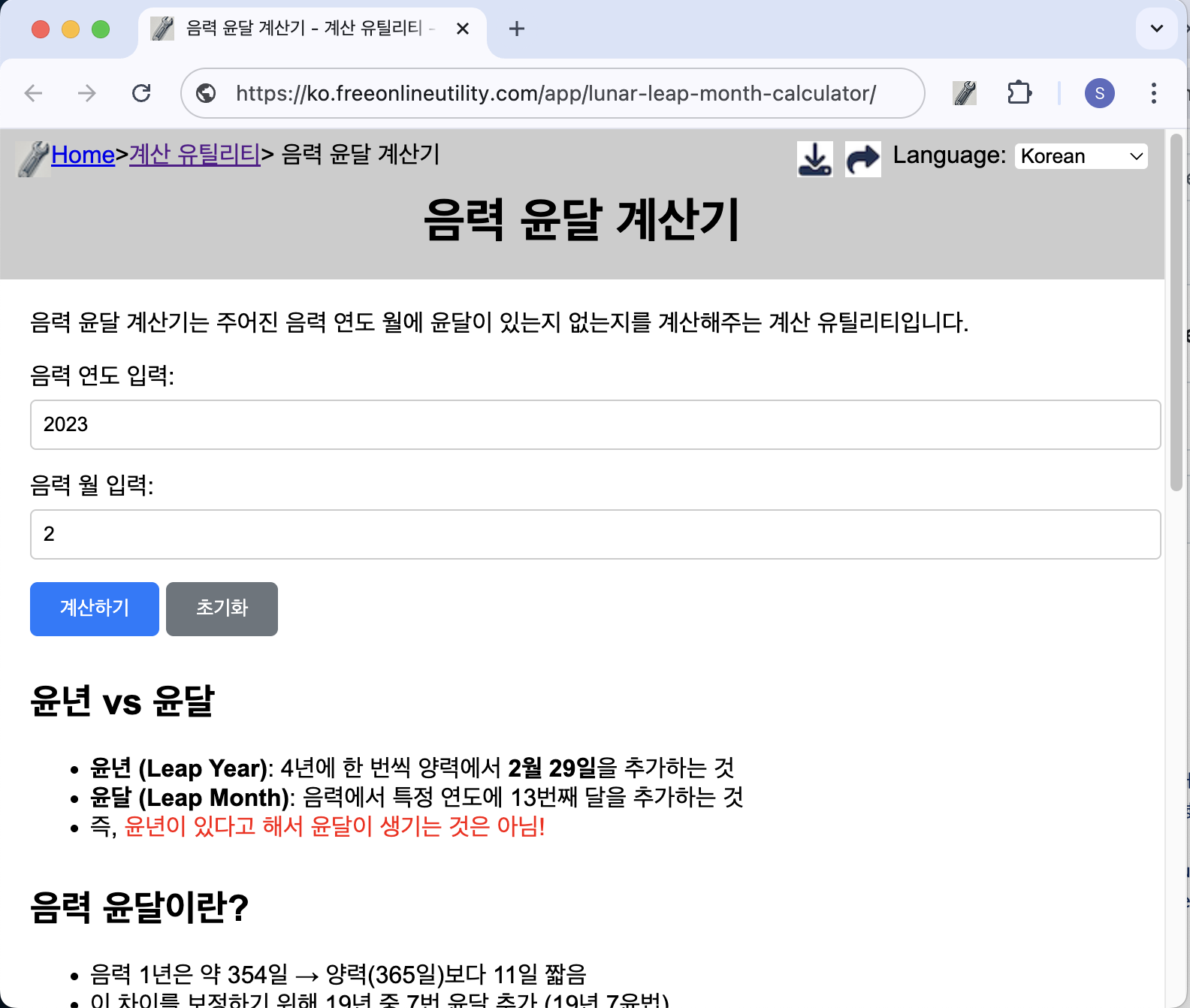 음력 윤달 계산기는 입력한 음력 연도와 월에 윤달이 존재하는지를 쉽고 빠르게 확인할 수 있는 무료 온라인 유틸리티입니다. 별도의 앱 설치 없이 브라우저만으로도 간편하게 사용할 수 있어, 누구나 접근하기 쉽고 직관적인 계산 경험을 제공합니다. 음력 윤달 계산기의 핵심 기능간단한 입력만으로 결과 확인: 음력 연도와 월만 입력하면 윤달 여부 즉시 확인 가능정확한 윤달 판단 기준: 19년 7윤법에 기반하여 과학적으로 윤달 존재 여부를 계산사용자 친화적인 인터페이스: 복잡한 설명 없이 직관적으로 사용할 수 있는 설계완전 무료 제공: 회원가입이나 설치 없이 100% 무료 이용 가능음력 윤달 계산기 가기음력 윤달 계산기 사용 방법음력 윤달 계산기 페이지로 이동합니다.음력 연도와 월을 입력합니다. (예: 2023년,..