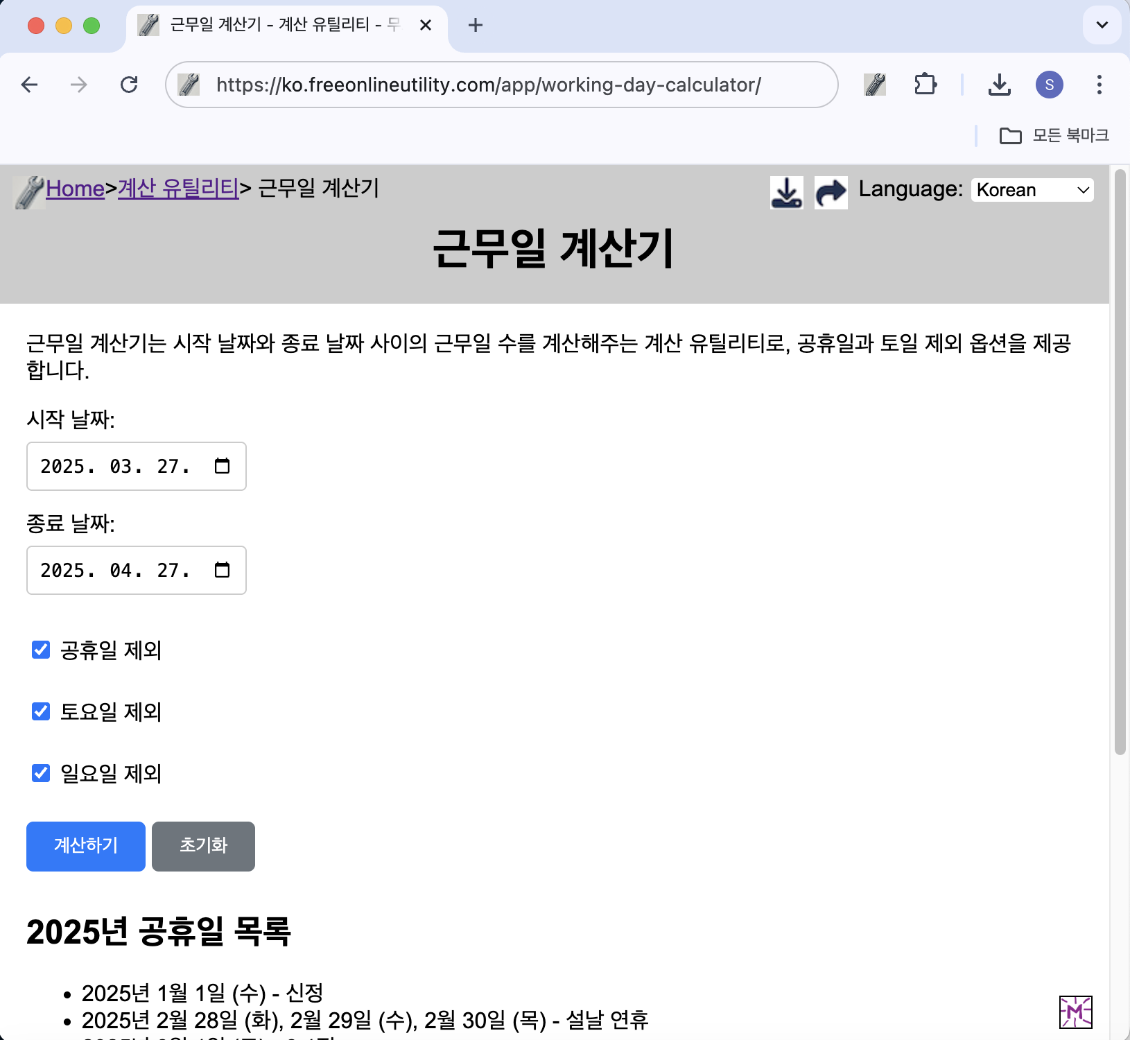 근무일 계산기는 시작일과 종료일을 입력하면 자동으로 근무일 수를 계산해 주는 무료 온라인 유틸리티입니다. 공휴일과 주말을 제외하는 옵션을 제공하여 더욱 정확한 계산이 가능합니다. 별도의 프로그램 설치 없이 웹 브라우저에서 바로 사용할 수 있습니다.지금 바로 근무일 계산기를 사용해보세요! 근무일 계산기의 주요 기능간편한 사용법: 시작 날짜와 종료 날짜를 입력하면 자동 계산정확한 근무일 산출: 공휴일, 토요일, 일요일 제외 가능빠른 결과 확인: 버튼 클릭 한 번으로 즉시 결과 제공무료 이용: 누구나 별도의 비용 없이 사용 가능근무일 계산기 가기근무일 계산기 사용 방법근무일 계산기 페이지로 이동합니다.시작 날짜와 종료 날짜를 입력합니다.공휴일과 주말 제외 여부를 선택합니다.계산하기 버튼을 클릭하면 결과가 즉..
