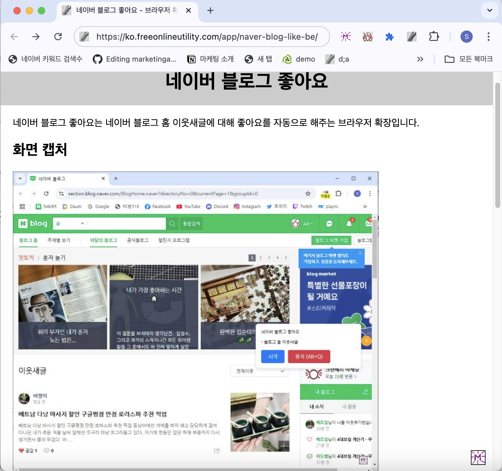 N사 블로그 좋아요는 N사 블로그 홈 이웃새글에 대해 자동으로 좋아요를 눌러주는 브라우저 확장입니다. 지금 사용해보세요. 주요 기능자동 좋아요 기능: 블로그 홈에서 새글을 감지하고 자동으로 좋아요를 누릅니다.간편한 조작: 시작/중지 버튼과 단축키로 손쉽게 설정 가능브라우저 확장 지원: 크롬 및 엣지 브라우저에서 사용 가능백그라운드 실행: 다른 작업을 하면서도 자동으로 좋아요 실행N사 블로그 좋아요 가기사용 방법N사 블로그 좋아요 페이지로 이동합니다.브라우저 확장을 다운로드하고 설치합니다.블로그 홈 이웃새글 페이지로 이동합니다.우측 중앙의 + 버튼을 눌러 좋아요 기능을 활성화합니다.시작 버튼을 누르면 자동으로 좋아요가 실행됩니다.활용 방법블로그 활동을 더욱 활발하게 하고, 이웃 블로거들과의 소통을 증대시키..
